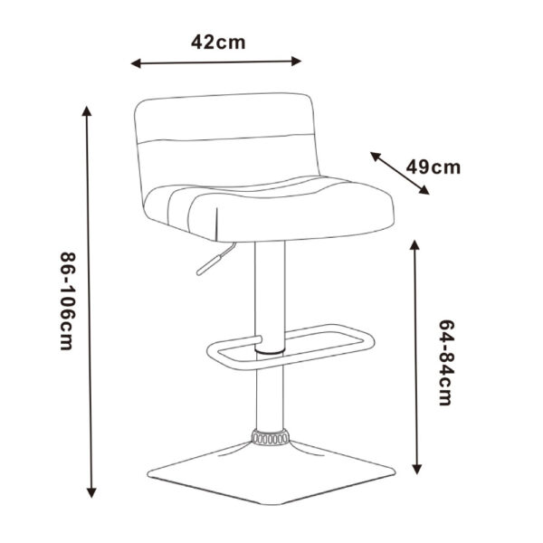Sodoben barski stol, ki je oblazinjen s kvalitetnim umetnim PU usnjem v sivi barvi in opremljen z nizkim naslonom za hrbet. Stol je vrtljiv in nastavljiv po višini, s plinskim mehanizmom v nosilnem stebričku. Sedišče stola se lahko tako nastavi od 64 cm do 84 cm višine. Kovinsko podnožje ima svetleč krom finiš. Na podnožju je tudi kvadratno opiralo za noge ki omogoča bolj udobno sedenje. Kvadratna talna plošča, prav tako kromirana, zagotavlja dobro stabilnost. Maksimalna nosilnost barskega stola je 120 kg.