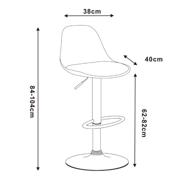 Praktičen barski stol z nastavljivo višino in vrtilno funkcijo, na voljo v povsem črni ali v sivi izvedbi s kromiranim podnožjem. Sedež je narejen iz PP materiala, z oblazinjenjem iz umetnega PU usnja. Višina sedišča se lahko nastavi od od 62 do 82 cm. Podnožje stola je narejeno iz kovine. Črna varijanta ima podnožje mat črne barve, prašno lakirano za boljšo zaščito pred okoljem, siva barva pa ima podnožje s krom finišem. Stol je opremljen tudi z naslonjalom za noge v obliki polmeseca, za bolj udobno sedenje. Maksimalna nosilnost barskega stola je 120 kg.