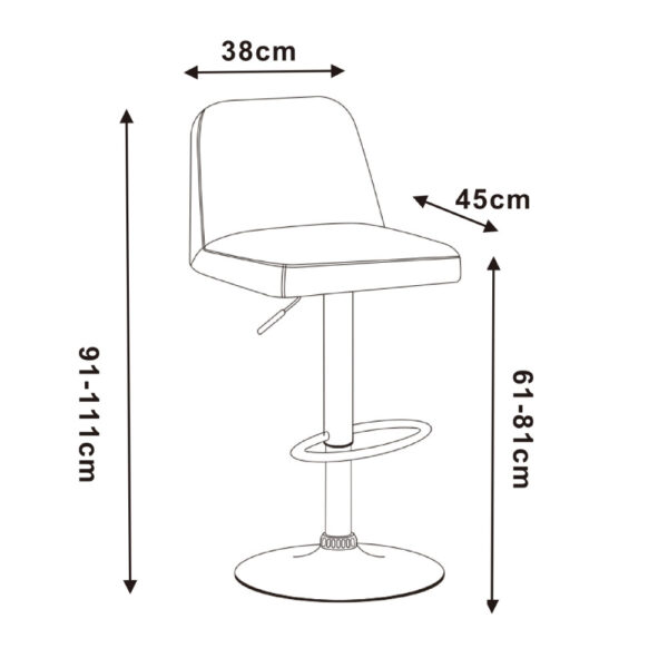 Praktičen barski stol, na voljo v sivi barvi. Stol je vrtljiv in nastavljiv po višini, s plinskim mehanizmom v nosilnem stebru. Višina sedišča se lahko nastavi od 61 do 81 cm. Sedišče in hrbtišče z zaobljenimi vogali sta oblazinjena z mehko tkanino, podnožje pa je opremljeno z naslonom za noge v obliki polmeseca.