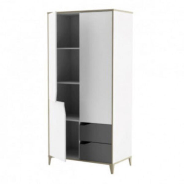 Garderobna omara iz linije otroške in mladinske sobe je narejena v skandinavskemu stilu. Dvignjene stožčaste nogice in robovi omare so v lesnemu dekorju.Omara je narejena iz robljenega iverala v prevladujoči beli barvi, ki jo dopolnjuje temno siva barva vratc predalov. Vratca imajo polkrožne izreze na robovih, ki nadomeščajo ročaje, hkrati pa predstavljajo lep dizajnerski dodatek.