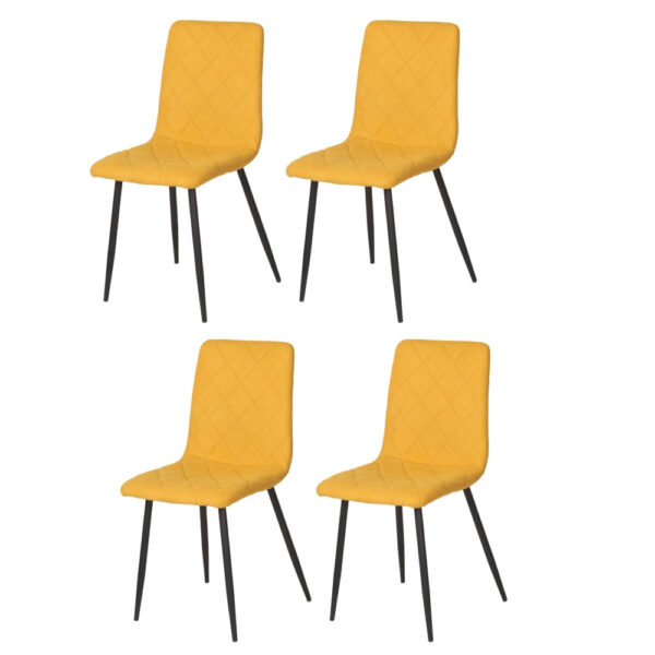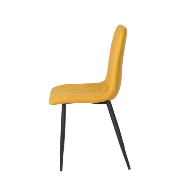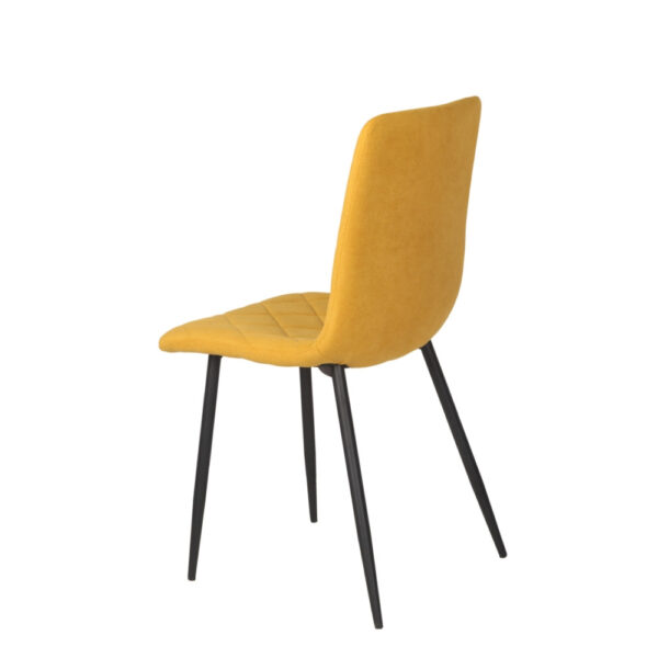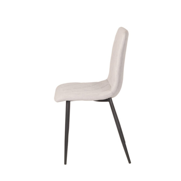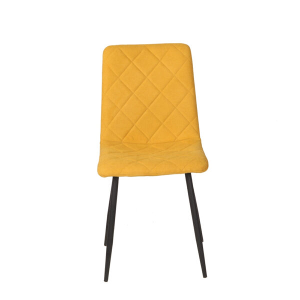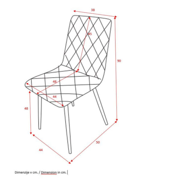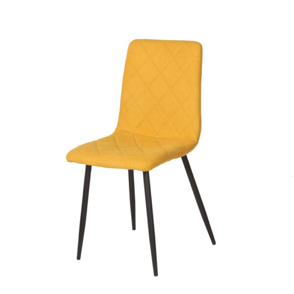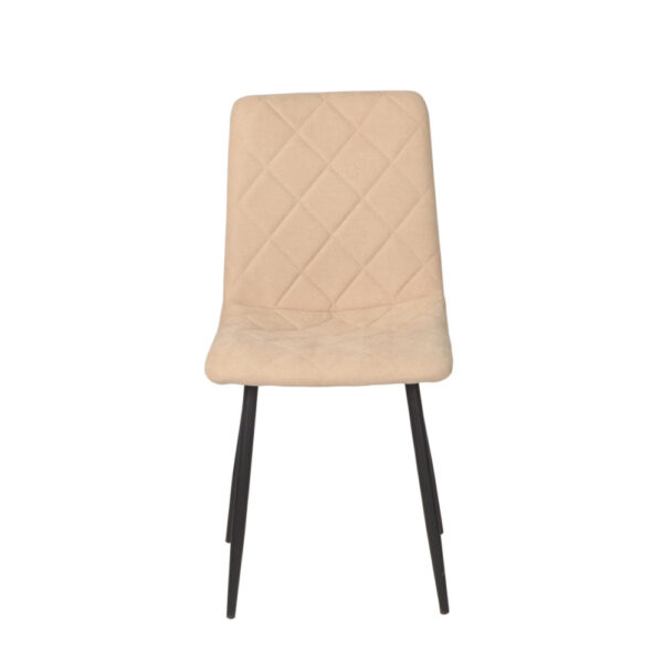 Preprost jedilniški stol, ki ima hrbtišče in sedišče v celoti oblazinjeno v kvalitetno tkanino. Sprednja stran stola ima čudovito prešitje v obliki rombov. Stol je na voljo v različnih barvah. Okrogle kovinske noge so premera 2,5 cm in so prašno lakirane v črno barvo. Višina sedišča je 47 cm. Maksimalna nosilnost stola je 120 kg.