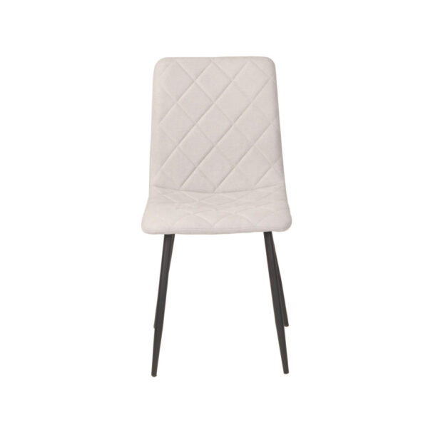 Preprost jedilniški stol, ki ima hrbtišče in sedišče v celoti oblazinjeno v kvalitetno tkanino. Sprednja stran stola ima čudovito prešitje v obliki rombov. Stol je na voljo v različnih barvah. Okrogle kovinske noge so premera 2,5 cm in so prašno lakirane v črno barvo. Višina sedišča je 47 cm. Maksimalna nosilnost stola je 120 kg