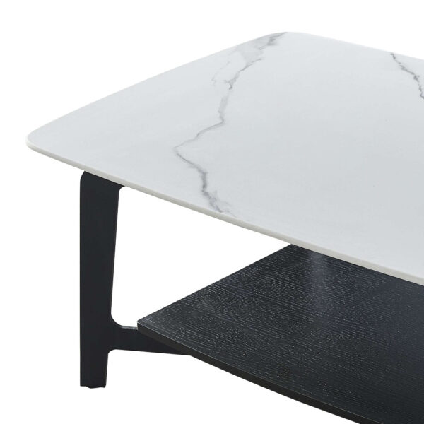 Praktična klubska miza, na voljo v Snow beli barvi z vzorcem marmorja in nogami v mat črni barvi. Mizna plošča je v celoti narejena iz sintranega kamna, debeline 12 mm in ima zaobljene vogale. Sintrani kamen je narejen iz kombinacije naravnega kamna v različnih barvah in ima več prednosti pred navadno keramiko. Je močnejši od velikih keramičnih plošč in se ne razbije zlahka. V primerjavi s ploščami iz naravnega granita pa je tudi naravno vodoodporen. Za dodatek pa je še okolju prijaznejši od kemično obdelanih kremenčevih plošč. Pod mizno ploščo je velika polica, kamor lahko odlagate revije, podstavke, skodelice itd. Podnožje mize je izdelano iz kovine in je za boljšo zaščito prašno lakirano. Spodnja polica je izdelana iz MDF materiala, barvanega v črno barvo ki se ujema z barvo podnožja. Maksimalna nosilnost keramične mizne plošče je 30 kg.