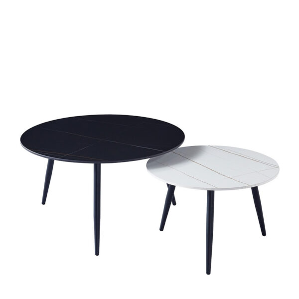 Set dveh klubskih miz okrogle oblike, manjša v mat Lauren belo zlati barvi in večja v mat Lauren črno zlati barvi, obe z marmornatim vzorcem. Mizni plošči sta izdelani iz sintranega kamna in sta debeli 1,2 cm. Sintrani kamen je narejen iz kombinacije naravnega kamna v različnih barvah in ima več prednosti pred navadno keramiko. Je močnejši od velikih keramičnih plošč in se ne razbije zlahka. V primerjavi s ploščami iz naravnega granita pa je tudi naravno vodoodporen.