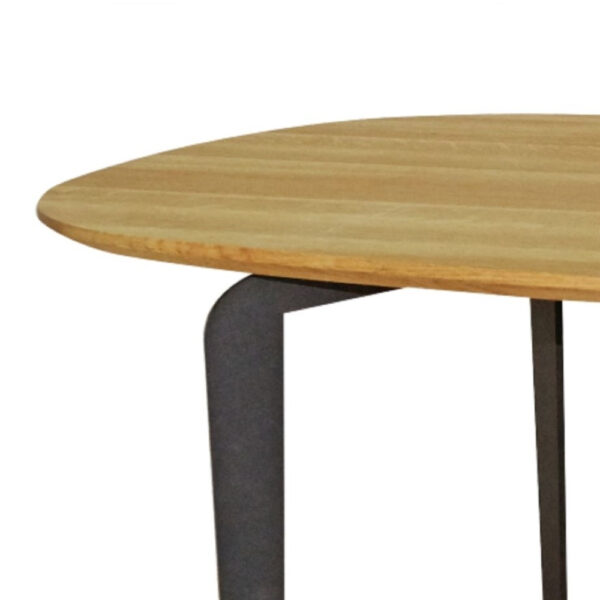 Moderna klubska miza z namizjem brez ostrih kotov. Plošča mize je narejena iz masivnega hrastovega lesa, z naoljeno površino. Robovi namizne plošče so zaobljeni na 60°, plošča pa je 1,8 cm debela in velika 110x60cm. Štirinožno podnožje je narejeno iz kovine in prašno lakirano v črno barvo za boljšo zaščito. Maksimalna nosilnost mize je 15 kg.
