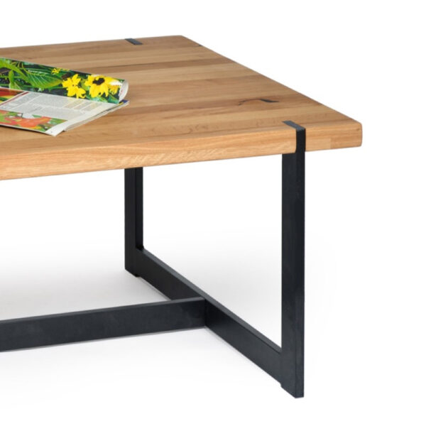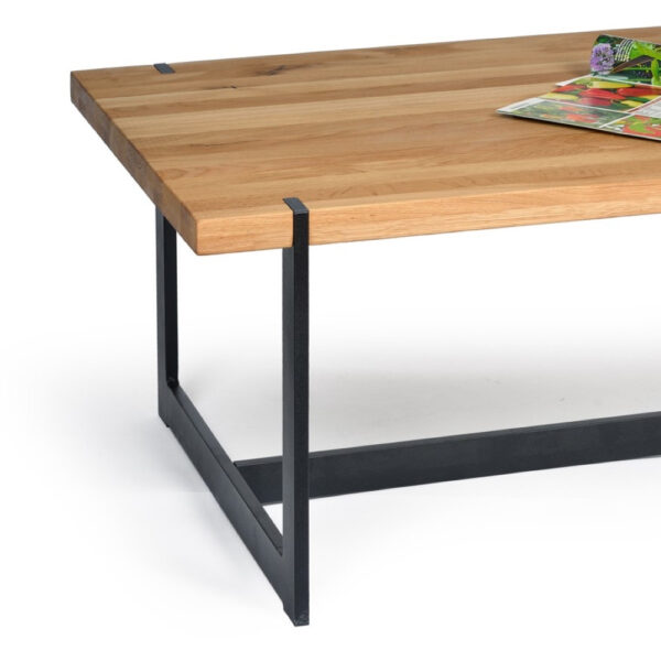 Velika klubska miza, v industrijskem stilu, ki kombinira videz naravnega lesa s kovinskim podnožjem v mat črni barvi. Pravokotna mizna plošča je narejena iz masivnega hrastovega lesa.