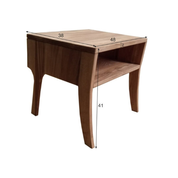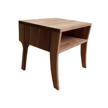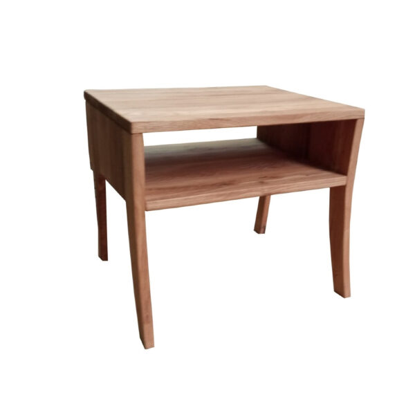 Nočna omarica, izdelana iz masivnega hrastovega lesa. Ukrivljene noge, zaobljeni robovi in naravni videz hrastovega lesa pripomore k prijetnemu organskemu občutku omarice. Namizje je kvadratne oblike, velikosti 48×38 cm, z eno odprto polico pod namizjem. Zgornja plošča je debela 2 cm. Nočna omarica pride že sestavljena.