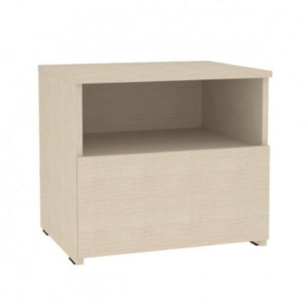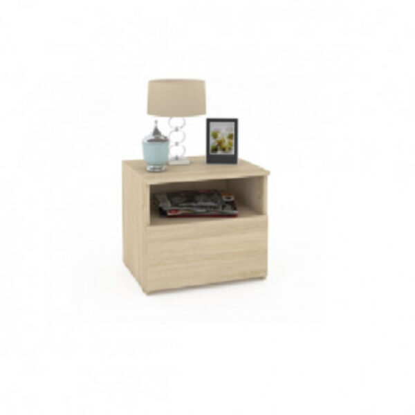 Nočna omarica v sonoma hrastu ima spodaj en predal ter nad njo priročno odprto polico.