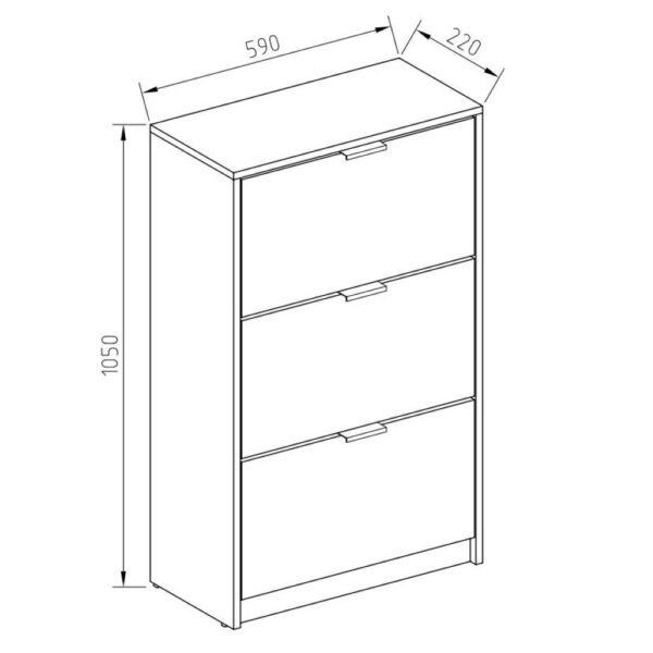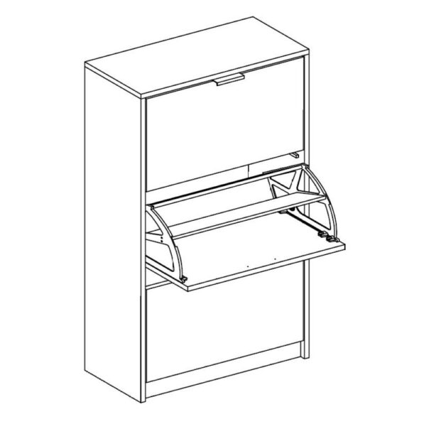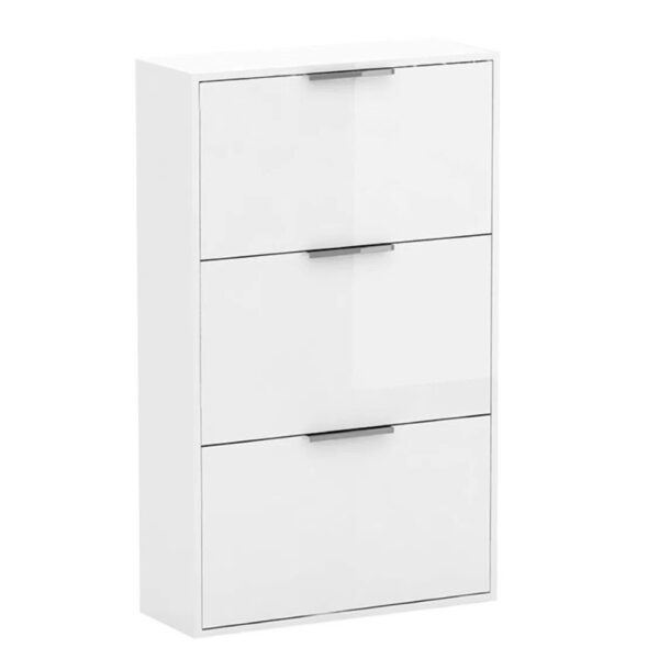 Omara za čevlje, ki bo s svojo svetlečo belo barvo visokega sijaja razsvetlila vašo garderobo ali hodnik. Omara je v celoti izdelana iz iverala, oblečenega v melamin in ima tri nagibne predale, vsak z eno vmesno pregrado za boljše koriščenje prostora, kamor lahko pospravite svoje čevlje, copate, itd.