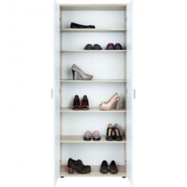 Prostorna omara za čevlje, v kombinaciji sonoma in bele barve. V notranjosti omare se nahaja pet fiksnih polic, s prostorom za od 12 do 18 parov čevljev. Omara je izdelana iz kakovostnega iverala, ročaji vrat pa so kovinski.
