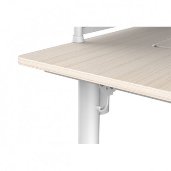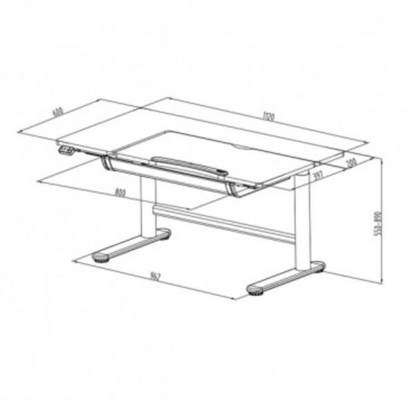 Sodobna pisalna miza bele, rjave in modre barve z avtomatsko nastavljivo višino, diagonalno nastavljivim namizjem in predalom za shranjevanje. Ima vgrajen električni motor, ki omogoča gladko spreminjanje višine mize samo s pritiskom na gumb. Premični mehanizem ima razpon 34 cm, kar omogoča, da se lahko namizje iz najnižjega položaja pri 55 cm dvigne na najvišji položaj na višini 89 cm in katerokoli višino med njima. Dodatna polica in nosilec za knjige sta visoka dodatnih 41,1 cm. Hitrost dviganja neobremenjene mize je 15 mm na sekundo. Deluje pri napetosti med 100 do 240V. Miza je opremljena s kljuko za torbe. Namizje se lahko nastavi pod kotom od 0° do 40°. Miza je opremljena s polico in nosilcem za knjige. Maksimalna obremenitev je 40 kilogramov.