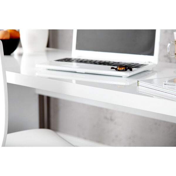 Preprosta računalniška miza brez predalov. Zgornja in stranski plošči so v beli barvi v visokem sijaju. Debelina plošče je 40mm. Maksimalna obremenitev namizja je 80 kg.