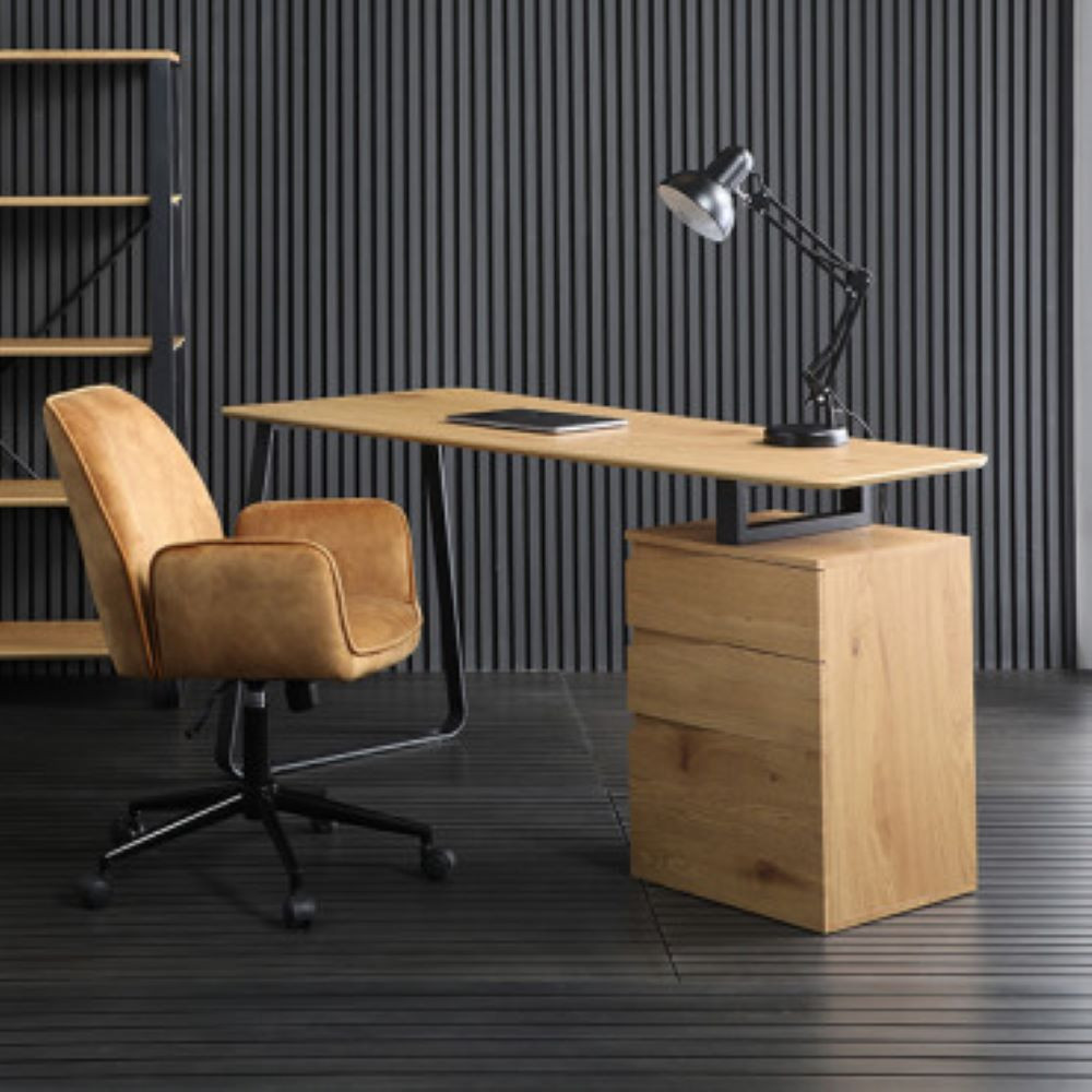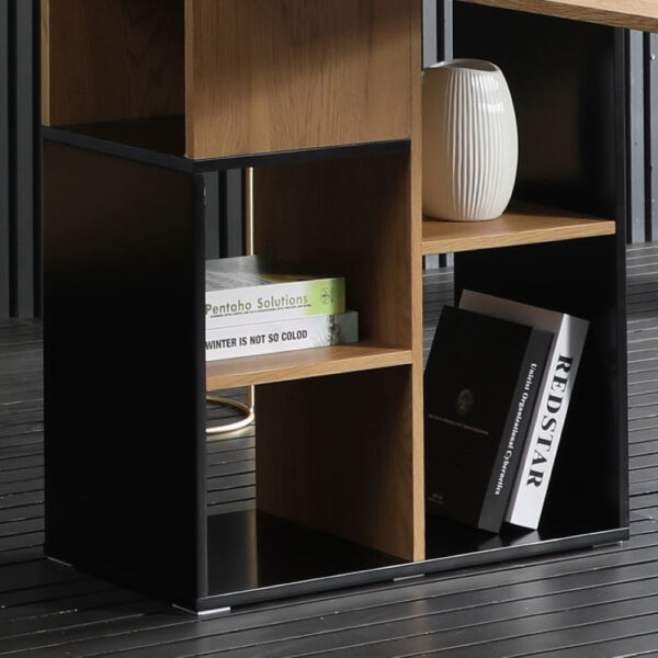 Moderna pisalna miza v industrijskem stilu, ki vam omogoča veliko prostora za odlaganje, ob enem pa z njeno razigrano obliko naredi svoj izgled še bolj atraktiven. Miza je v trendovski kombinaciji črne barve in imitacije hrastovega lesa.