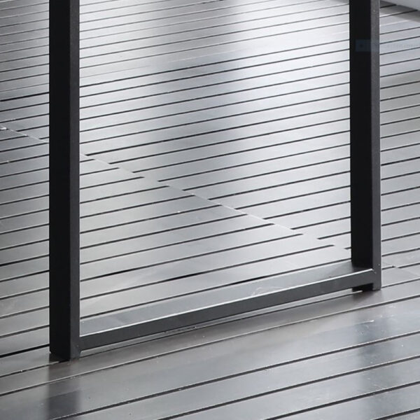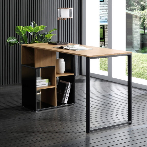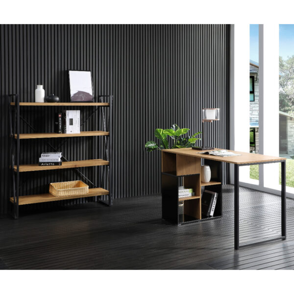 Moderna pisalna miza v industrijskem stilu, ki vam omogoča veliko prostora za odlaganje, ob enem pa z njeno razigrano obliko naredi svoj izgled še bolj atraktiven. Miza je v trendovski kombinaciji črne barve in imitacije hrastovega lesa. Kovinska noga v obliki črke U, je prašno lakirana v črni mat barvi. Na drugi strani, pa je namesto noge uporabljen poličnik s petimi odprtinami različnih velikosti, kjer boste lahko odložili svoje stvari. Miza vam omogoča 120×60 cm delovne površine, visoka pa je 75 cm. Mizna plošča je narejena iz MDF materiala in oblečena z furnir. Debelina plošče je 1,5 cm. Maksimalna obremenitev mize je 80 kg