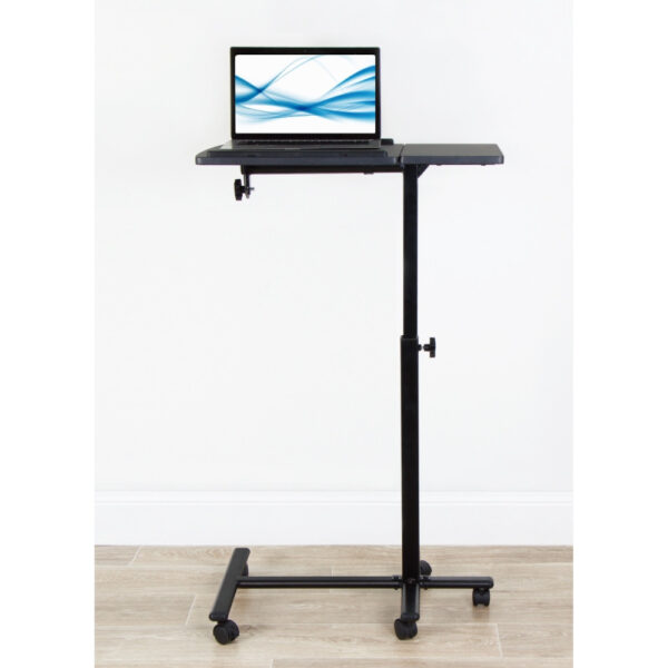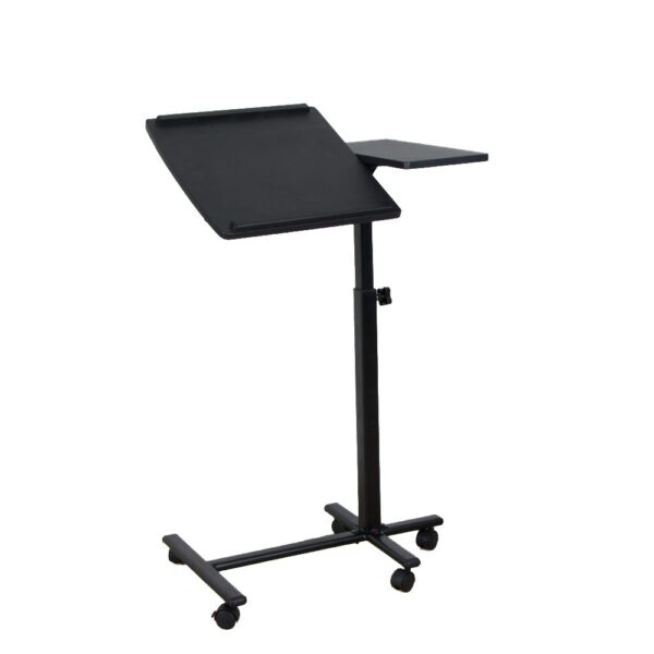 Pisalna miza z nastavljivo višino mizne plošče, na voljo v črni barvi. Miza je opremljena s petimi kolesci za lažje premikanje, montiranimi na široko podnožje ki zagotavlja stabilno podlago. Primerna je za prenosne računalnike, tablice, e-bralnike, knjige ali pa le kot majhna pisalna miza. Uporablja se lahko doma, v pisarni, dnevni sobi, primerna pa je tudi za predstavitve, predavanja, seminarje, konference in podobne dogodke. Maksimalna nosilnost namizja je 3 kg.