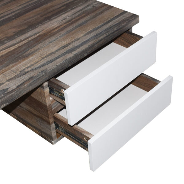 Minimalistična pisalna miza, ki združi sodoben dizajn s klasičnim stilom. Izdelana je iz visokokakovostnih ivernih plošč, oblečenih v PVC. Debelina plošče je 25 mm. Kovinske noge so prašno lakirane v beli barvi, velikosti 20×20 mm in debeline 0,6 mm. Delovna površina je velika 120x 60 cm, na višini 76 cm, s površino v imitaciji orehovega lesa. Na desni strani pod namizjem sta dva predala bele barve, s kovinskimi vodili. Maksimalna nosilnost mize je 45 kg.