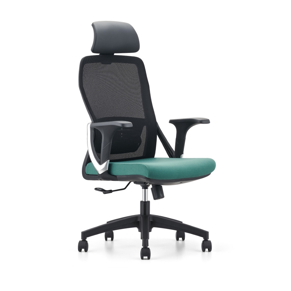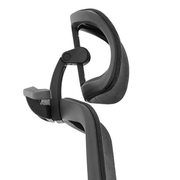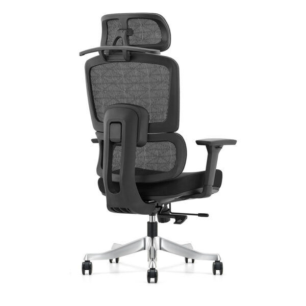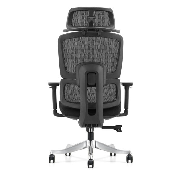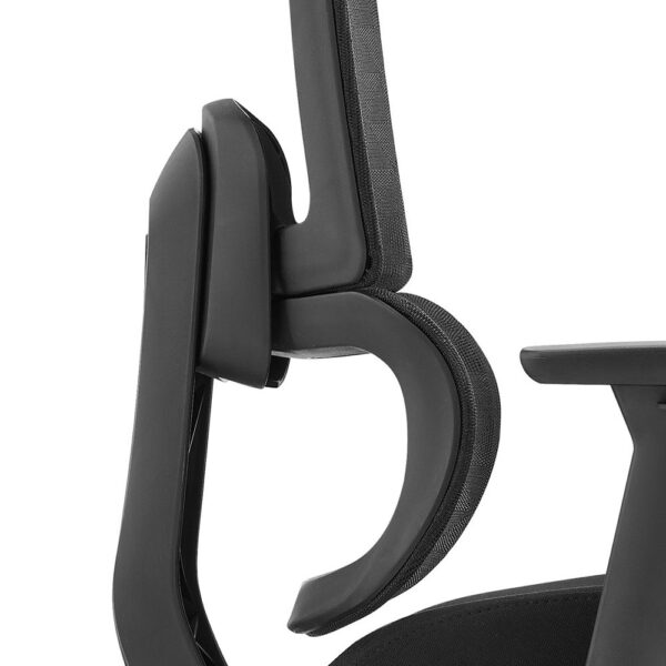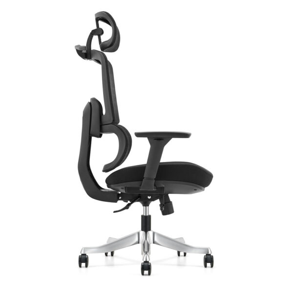 Ergonomičen pisarniški stol v črni barvi, primeren za pisarno prihodnosti!  Stol je vrtljiv in nastavljiv po višini, s plinskim mehanizmom v glavnem stebričku, poleg tega pa ponuja tudi več drugih možnosti za prilagajanje. Hrbtišče stola je izdelano iz najlona in oblazinjeno z mrežasto tkanino ki prepušča zrak. Opremljeno je z mehanizmom ki omogoča da se lahko samo hrbtišče nastavlja po višini neodvisno od glavnega plinskega mehanizma. Hrbtišče ima poleg tega tudi nastavljivo ledveno podporo, 2D nastavljiv vzglavnik in vgrajen obešalnik kjer lahko obesite jakno ali druga oblačila. Črni rokonasloni so narejeni iz poliuretana in so nastavljivi v treh dimenzijah. Večpozicijski mehanizem z drsnikom omogoča da si lahko po želji nastavite tudi primerno globino stola. Sedež je za večje udobje napolnjen z brizgano peno. Podnožje stola je izdelano iz aluminija in ima 60 mm PU kolesca, s tihim gibanjem. Maksimalna nosilnost teže je 120 kg.