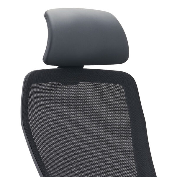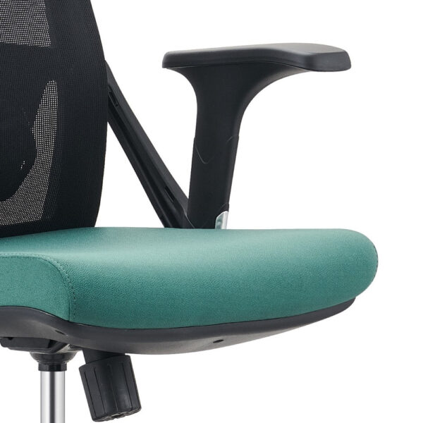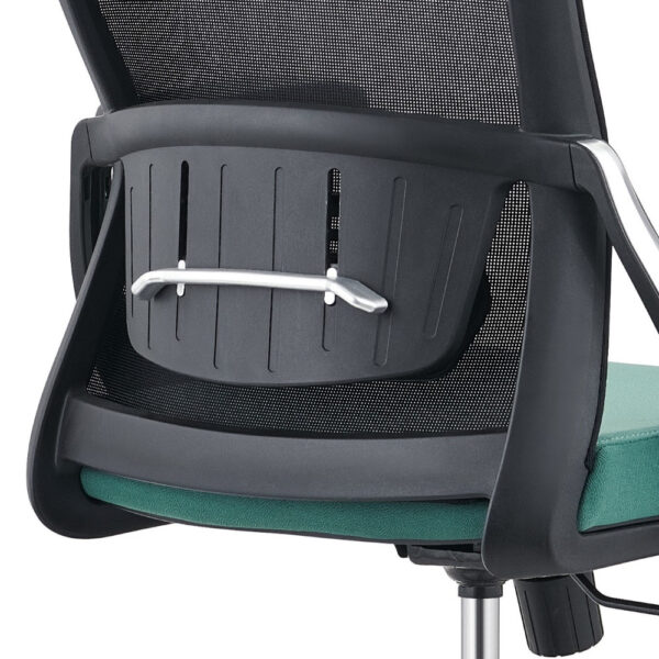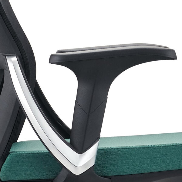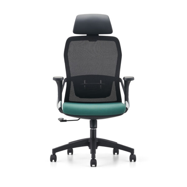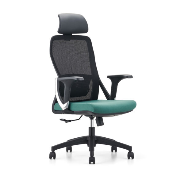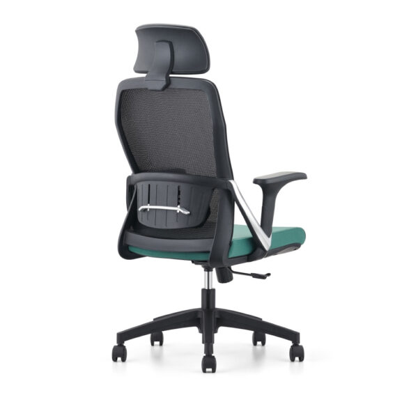 Sodoben pisarniški stol, na voljo v kombinaciji črne in zelene barve. Stol je vrtljiv in nastavljiv po višini, s plinskim mehanizmom v nosilnem stebričku. Naslon za hrbet s podporo je črne barve in narejen iz mrežaste tkanine, ki omogoča prost pretok zraka med naslanjanjem. Plastični rokonasloni so fiksni, naslon za glavo je nastavljiv po višini. Sedišče stola je oblazinjeno z zeleno tkanino s prevleko iz plastike in je za večje udobje polnjeno s peno.