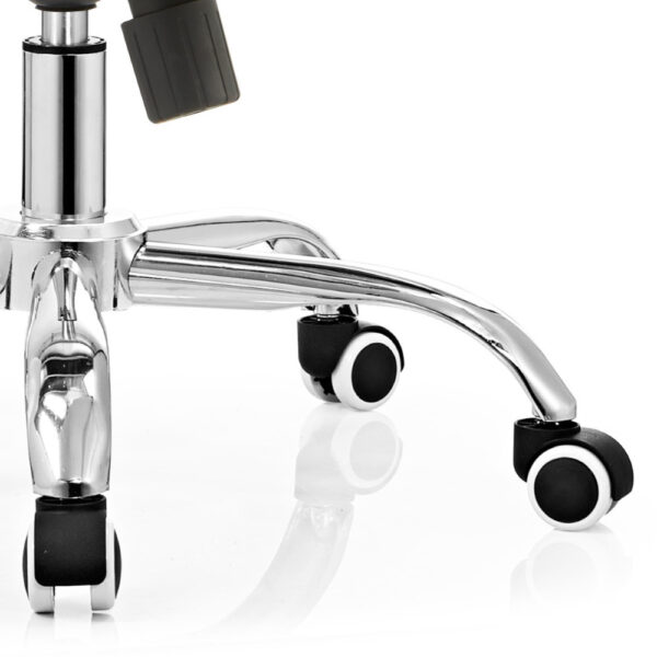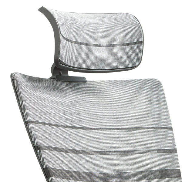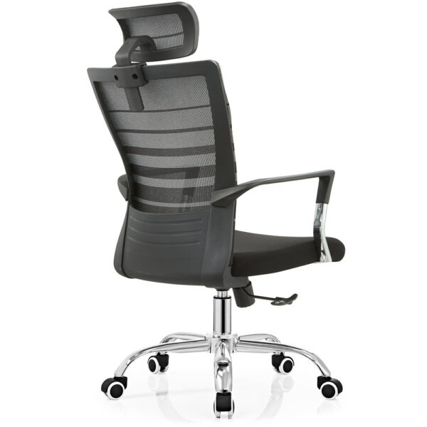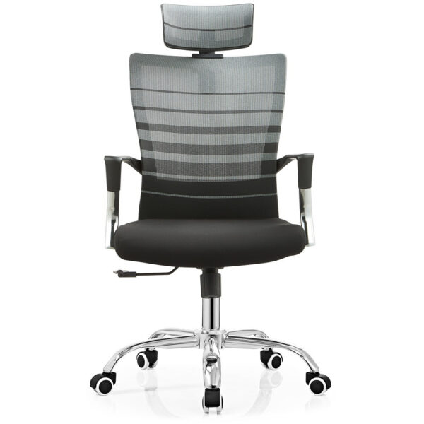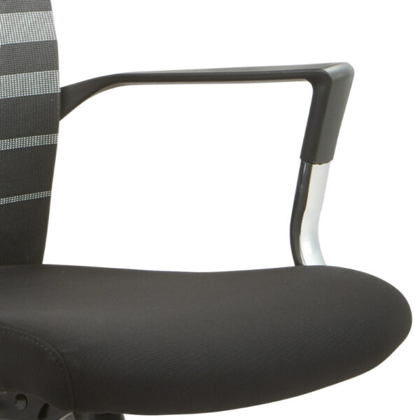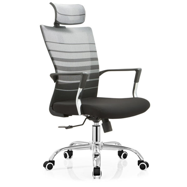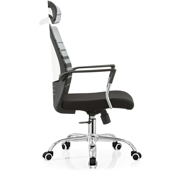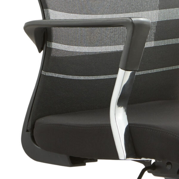 Modern pisarniški stol, ki ima sedišče oblazinjeno s kvalitetno tkanino, naslon pa je prevlečen z mrežo, ki stolu daje zračnost. Je vrtljiv in nastavljiv po višini. Stol je obogaten z metuljastim mehanizmom. Sedišče je narejeno iz pene. Rokonasloni so fiksni in narejeni iz kromiranega jekla. Podnožje je kromirano in ima 5 gumiranih kolesc v beli barvi. Maksimalna nosilnost stola je 110 kg.