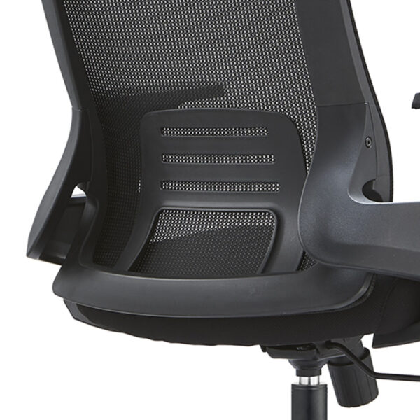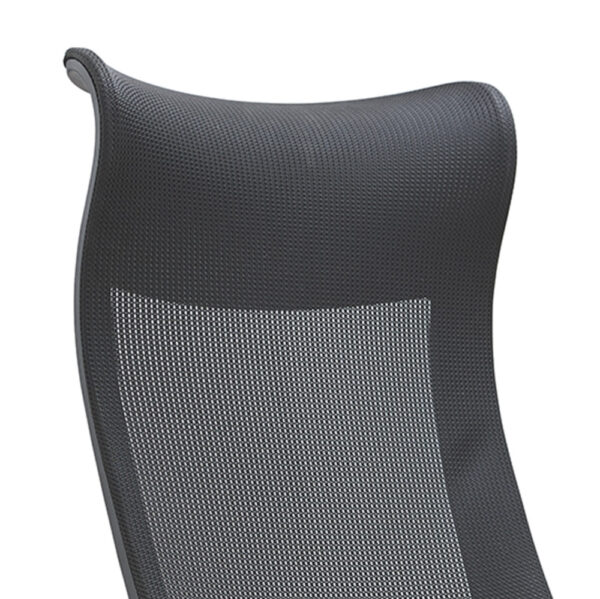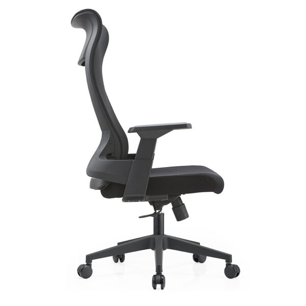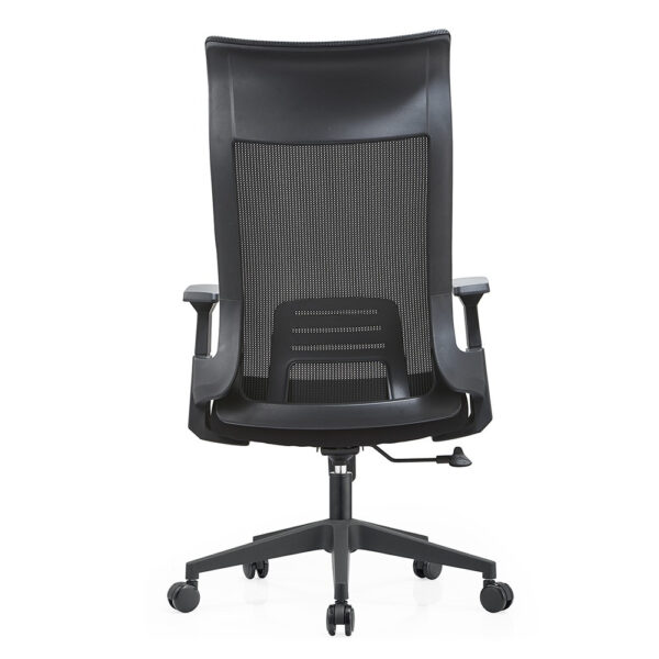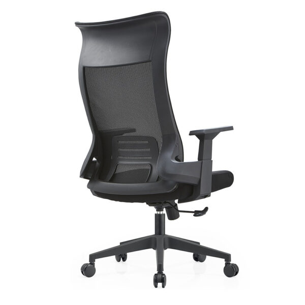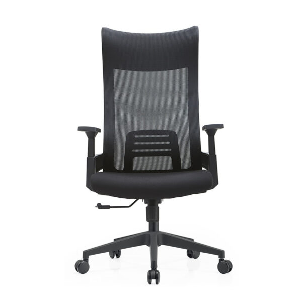 Pisarniški stol z ergonomsko oblikovanim visokim hrbtiščem, na voljo v povsem črni barvi. Stol je vrtljiv in nastavljiv po višini, s plinskim mehanizmom v nosilnem stebričku. Rokonasloni so fiksni in se ne premikajo. Hrbtišče je narejeno iz mrežaste tkanine, ki omogoča pretok zraka, sedišče pa je oblazinjeno z neprepustno tkanino in napolnjeno s peno za udobnejše sedenje.