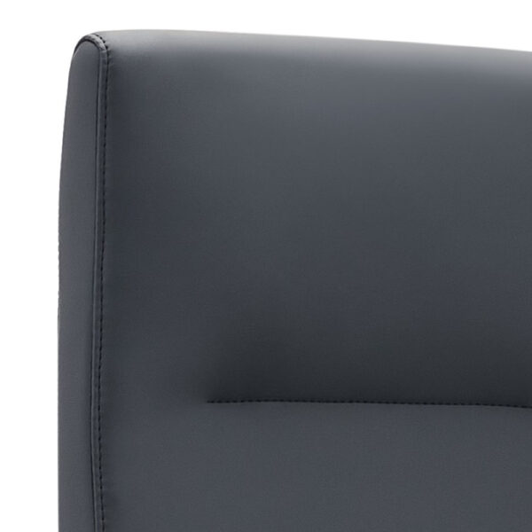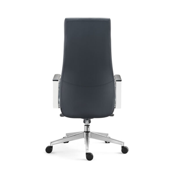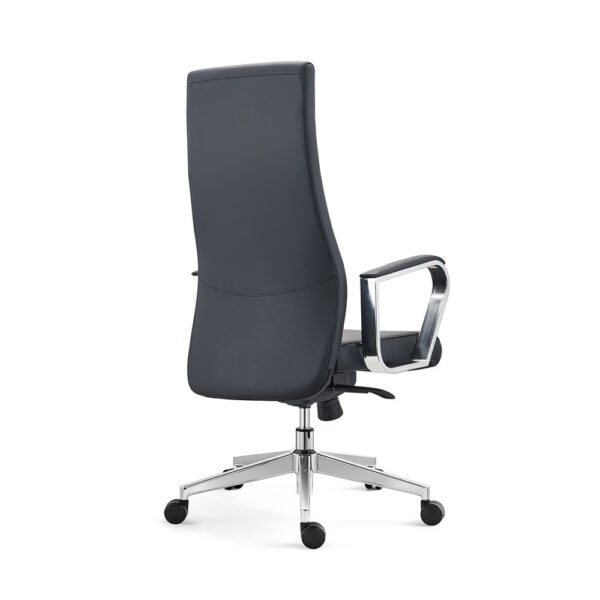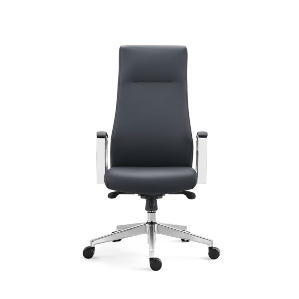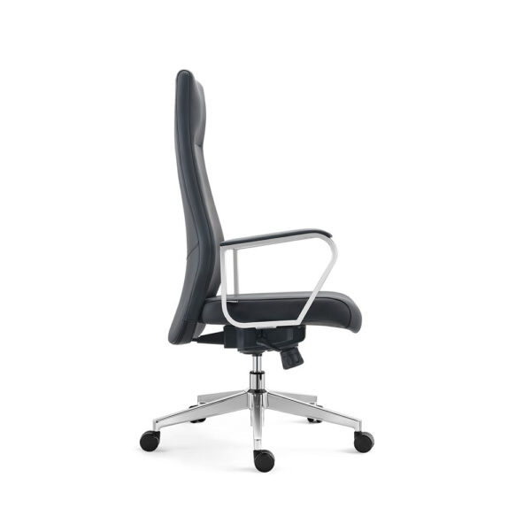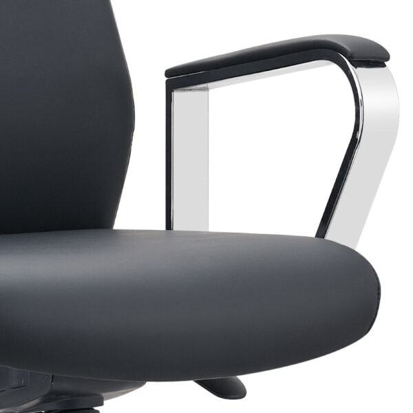 Eleganten pisarniški stol črne barve, v kombinaciji pravega kravjega usnja in PVC tkanine. Je vrtljiv in nastavljiv po višini. Sedišče ima v notranjosti peno z visoko gostoto, kar vam omogoča udobno sedenje. Ima fiksne rokonaslone, ki so narejen iz aluminija. Stol je obogaten z štiripozicijskim nagibnim mehanizmom. Podnožje je aluminjasto, s kromiranim finišem in ima 5 PU kolesc v črni barvi. Maksimalna obremenitev stola je 120 kg.