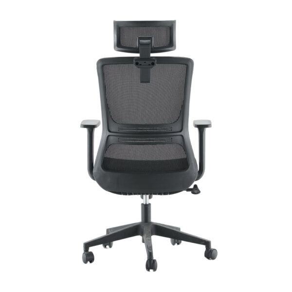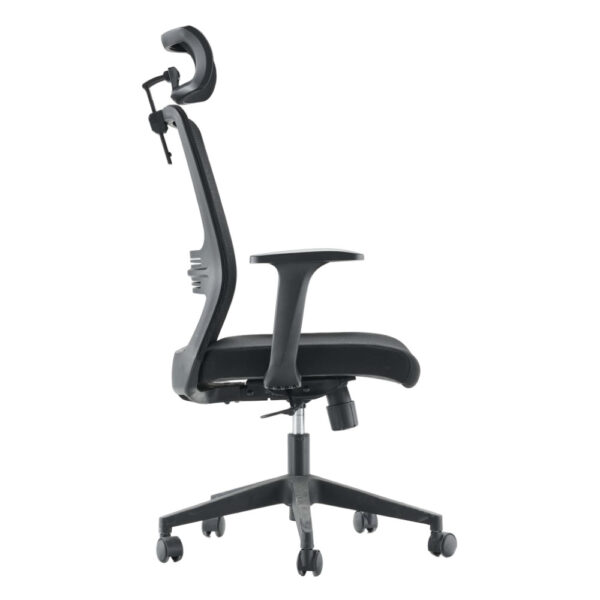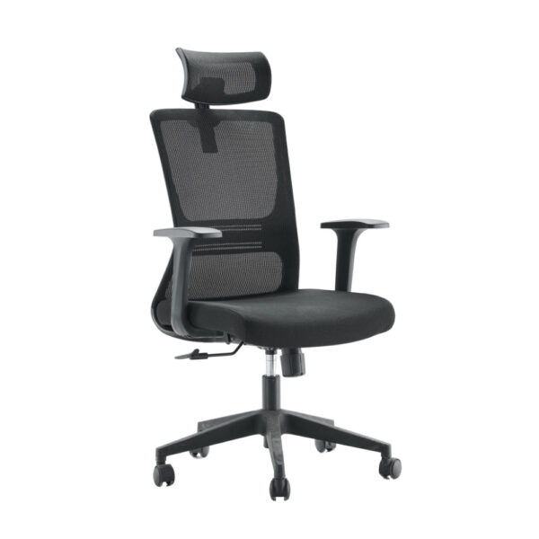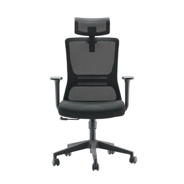 Udoben pisarniški stol, na voljo v črni barvi. Stol je vrtljiv, nastavljiv po višini in ima ergonomsko oblikovano hrbišče. Po sedišču je oblazinjen z neprepustno tkanino in po hrbtišču s kvalitetno mrežno tkanino ki omogoča zračenje. Sedišče je napolnjeno s peno visoke gostote, za udobnejše sedenje. Stol je opremljen z metuljček mehanizom za nastavljanje nagiba. Naslon za glavo nastavljivi po višini, rokonasloni so fiksni. Črno podnožje stola je izdelano iz polipropilena in ima 5 najlonskih kolesc. Maksimalna nosilnost stola je 100 kg.