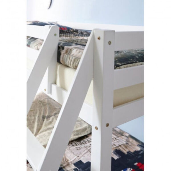 Velik pograd z dvema različno velikima ležiščema. Izdelan je iz masivnega bukovega lesa in je na voljo v povsem beli barvi. Zgornje ležišče je narejeno za vzmetnico velikosti 200×90 cm in ima maksimalno nosilnost 100 kg. Spodnje ležišče je narejeno za vzmetnico velikosti 200×140 cm in ima maksimalno nosilnost 180 kg. Idealna postelja za majhne prostore, ki hkrati omogoči več prostora in varnejše vstajanje s spodnjega ležišča. Letveni pod je vključen z nakupom. Vzmetnice niso priložene!