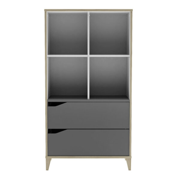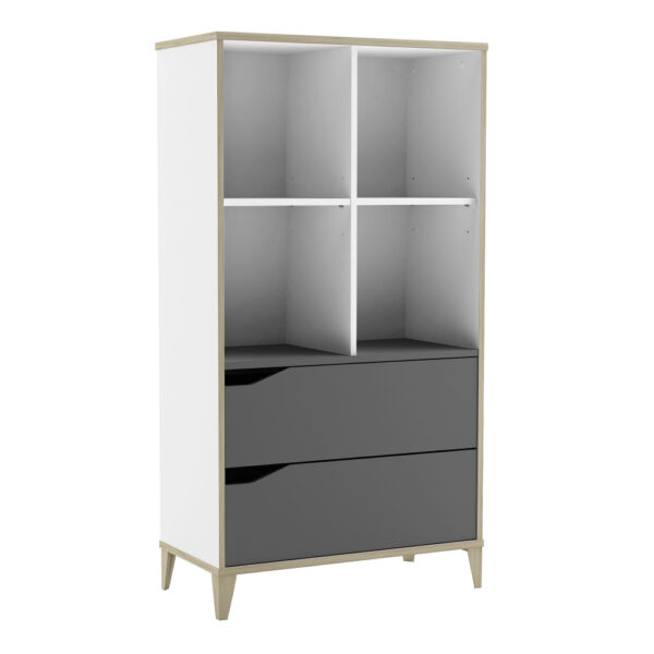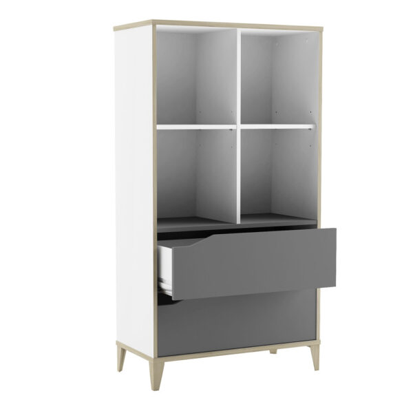 Poličnik v skandinavskem stilu, ki je lahko odlična rešitev za shranjevanje v otroški ali mladinski sobi. Vključuje 4 odprte police, ki so po višini nastavljive, ter dva velika, prostorna predala, z krogljičnimi vodili. Zaradi svoje vsestranskosti lahko poličnik uporabite, da pospravite knjige, okrasne predmete, oblačila in igrače. Zasnovan je za otroke, zato imajo predali polkrožne izreze, ki nadomeščajo ročaje, kar omogoča varnost in praktičnost. Poličnik stoji na štirih stožiščastih nogicah. Narejen je iz robljenega iverala v kombinaciji bele in sive barve. Zgornja in spodnja plošča sta debeline 18 mm, ostale pa so 15 mm.