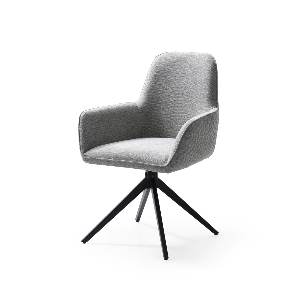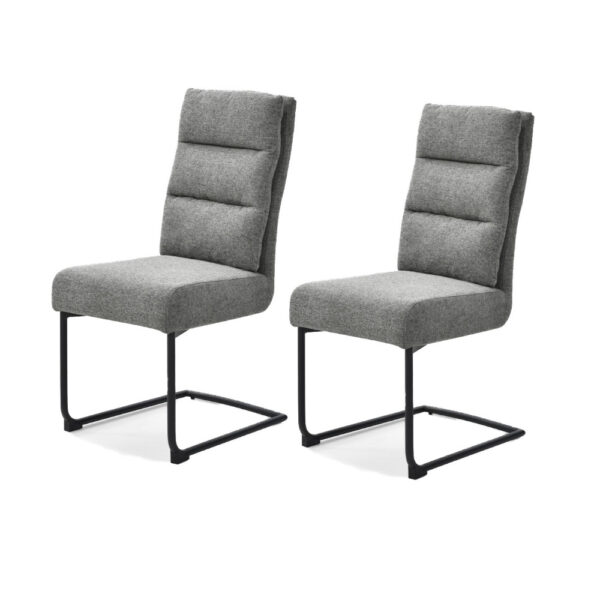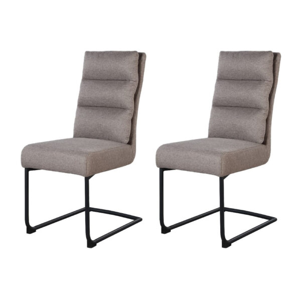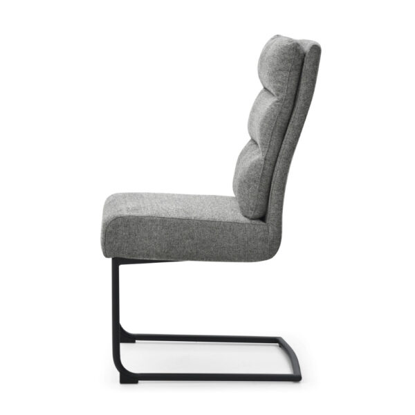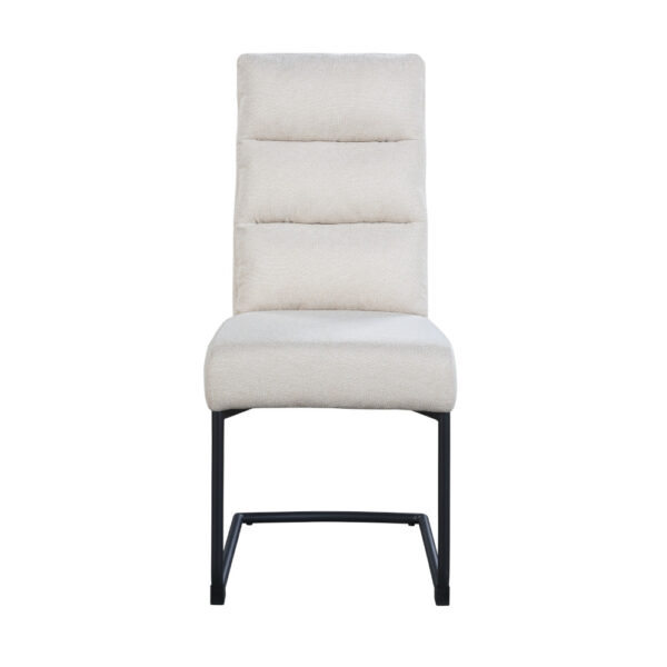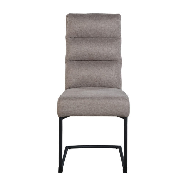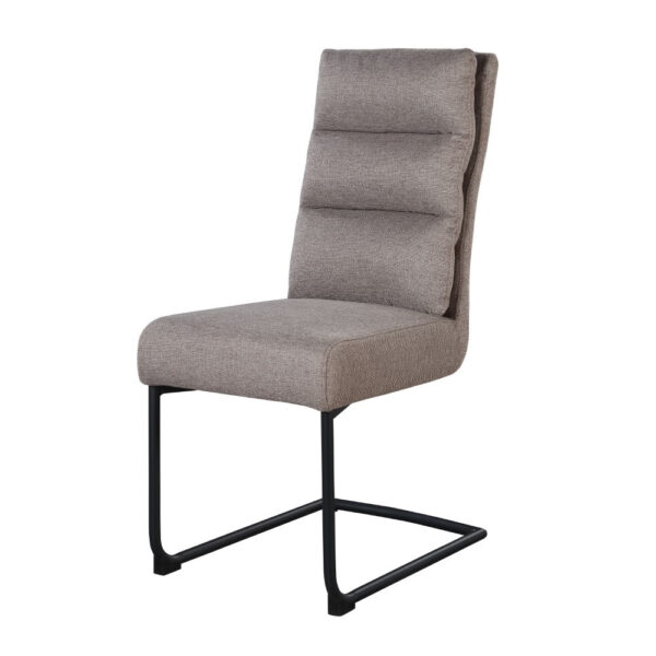Jedilniški stol, opremljen z vzmetenjem in oblazinjen s tkanino, na voljo v več barvah. Po naslonjalu ima dve plasti oblazinjenja, z zunanjo plastjo prešito z okrasnimi šivi za lepši izgled.