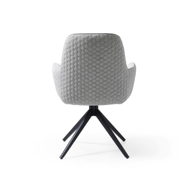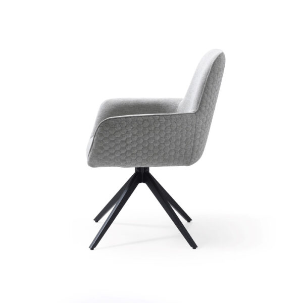 Oblazinjen jedilniški stol, na voljo v sivi barvi. Celoten stol z rokonasloni je oblazinjen v mehko tkanino. Po zunanjem delu hrbtišča in rokonaslonov je prešit z okrasnimi šivi v šestkotnem vzorcu. Sedišče je napolnjeno z gosto peno za udobnejše sedenje, z lažjo peno pa je napolnjeno tudi hrbtišče. Stol se lahko zavrti za 180°.